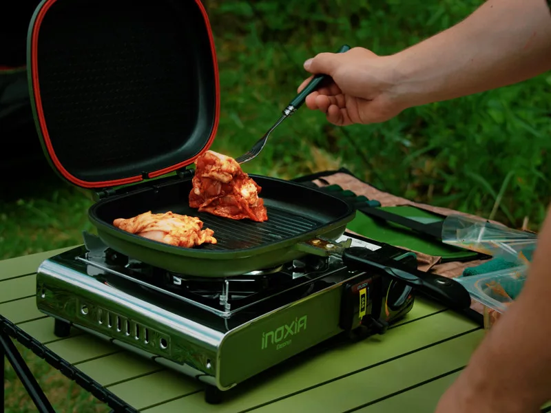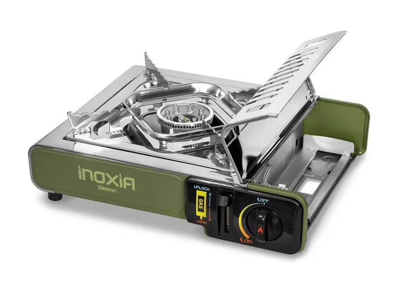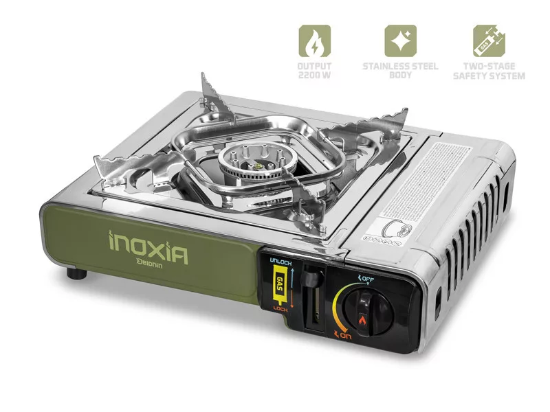 Erőteljes és stabil DELPHIN gázfőző, 2000 W teljesítménnyel, amely lehetővé teszi, hogy bárhol a természetben finom ételeket készítsen – ugyanolyan kényelmesen, mint otthon.