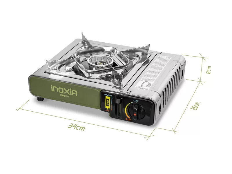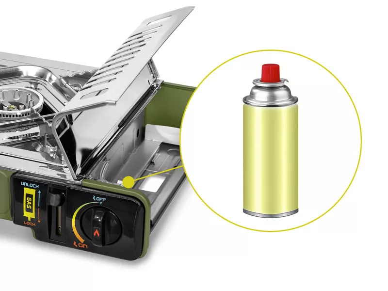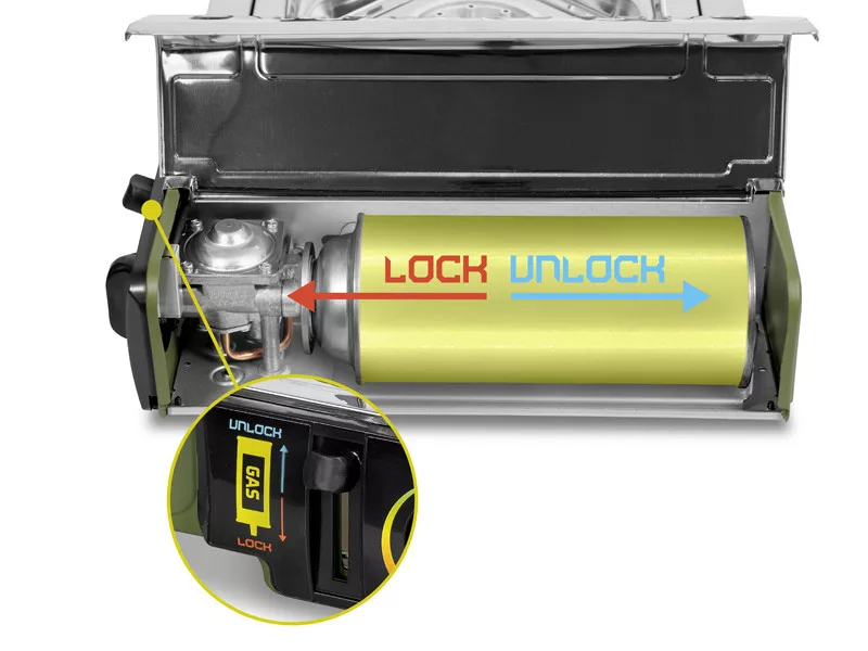 A főző CP250 típusú, 400 ml-es propán-bután gázpatronnal működik. Kétfokozatú biztonsági rendszerrel van ellátva, amely maximális biztonságot nyújt használat közben. A láng begyújtásához először rögzíteni kell a patront a főző elején található karral. Ez jelentősen csökkenti a véletlen gázszivárgás vagy automatikus kiengedés kockázatát.
