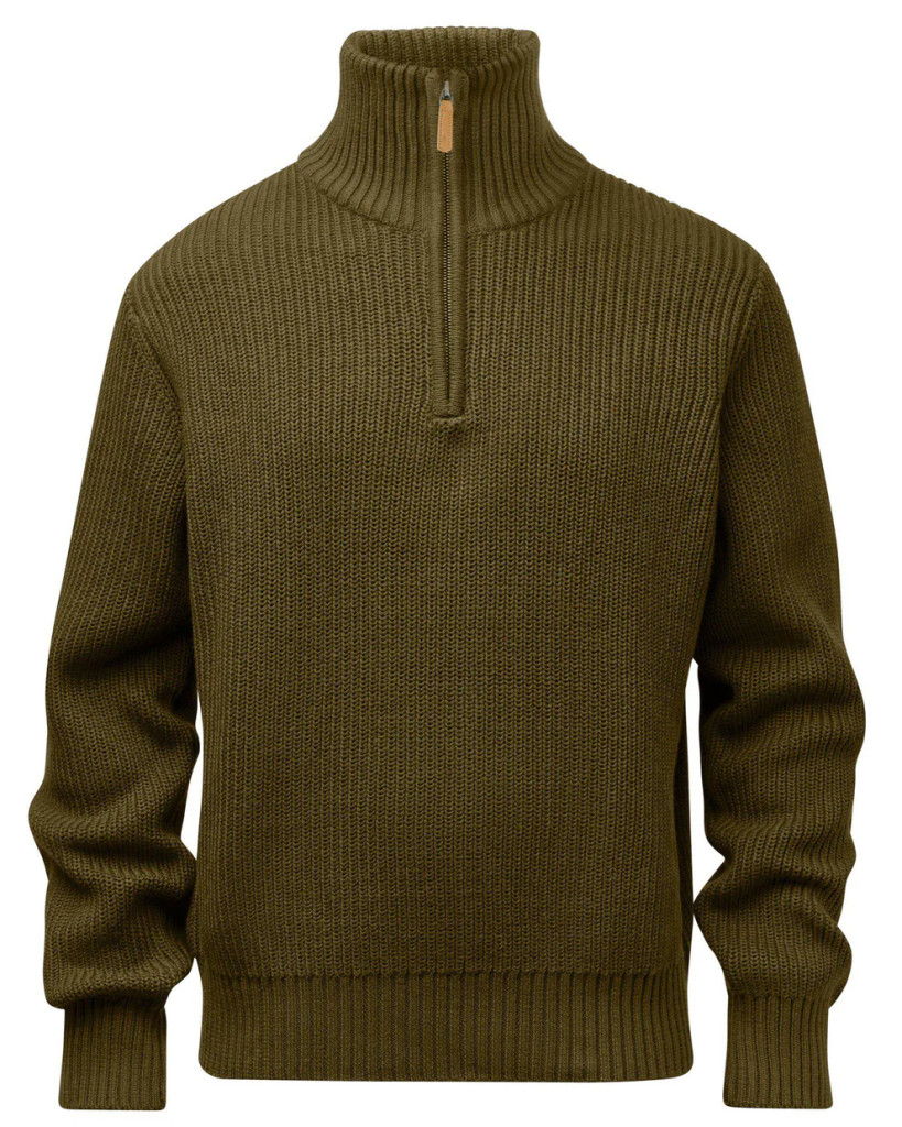 Kötött pulóver fél cipzárral, bordázott mandzsettával, szegéllyel és gallérral. Sokoldalú darab, minden alkalomra alkalmas.