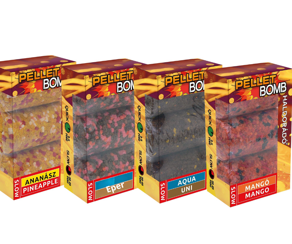 A Pellet Bomb Slow és Quick, tehát lassú (30-45 perc) és gyors (3-5 perc) oldódási tulajdonsággal rendelkező változatokban érhető el a kínálatban, négyféle összetételben. Ezek közül az Ananász és a Mangó ízesítettek, míg az Aqua Classic és az Aqua Uni natúr változatok.
