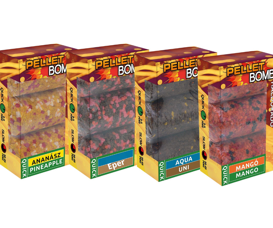 A Pellet Bomb Slow és Quick, tehát lassú (30-45 perc) és gyors (3-5 perc) oldódási tulajdonsággal rendelkező változatokban érhető el a kínálatban, négyféle összetételben. Ezek közül az Ananász és a Mangó ízesítettek, míg az Aqua Classic és az Aqua Uni natúr változatok.