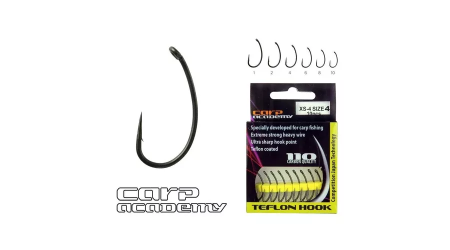A Carp Academy XS 2 horog masszív, robosztus horogtípus. A horog kis erőhatás mellett is gyors és pontos behatolást eredményez, köszönhetően a rendkívül sima felületnek, amit a teflon bevonat biztosít. Ezenfelül ez a horog 20%-kal vastagabb az átlagos horgoknál, ezáltal még erősebb lett. Hegye különösen tartós, így a legnehezebb terepeken történő horgászatra is ajánlott.